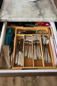 I have a fitted and flat sheet, so they’re easy to straighten. Then a comforter. Again, easy to straighten out and make it look good.