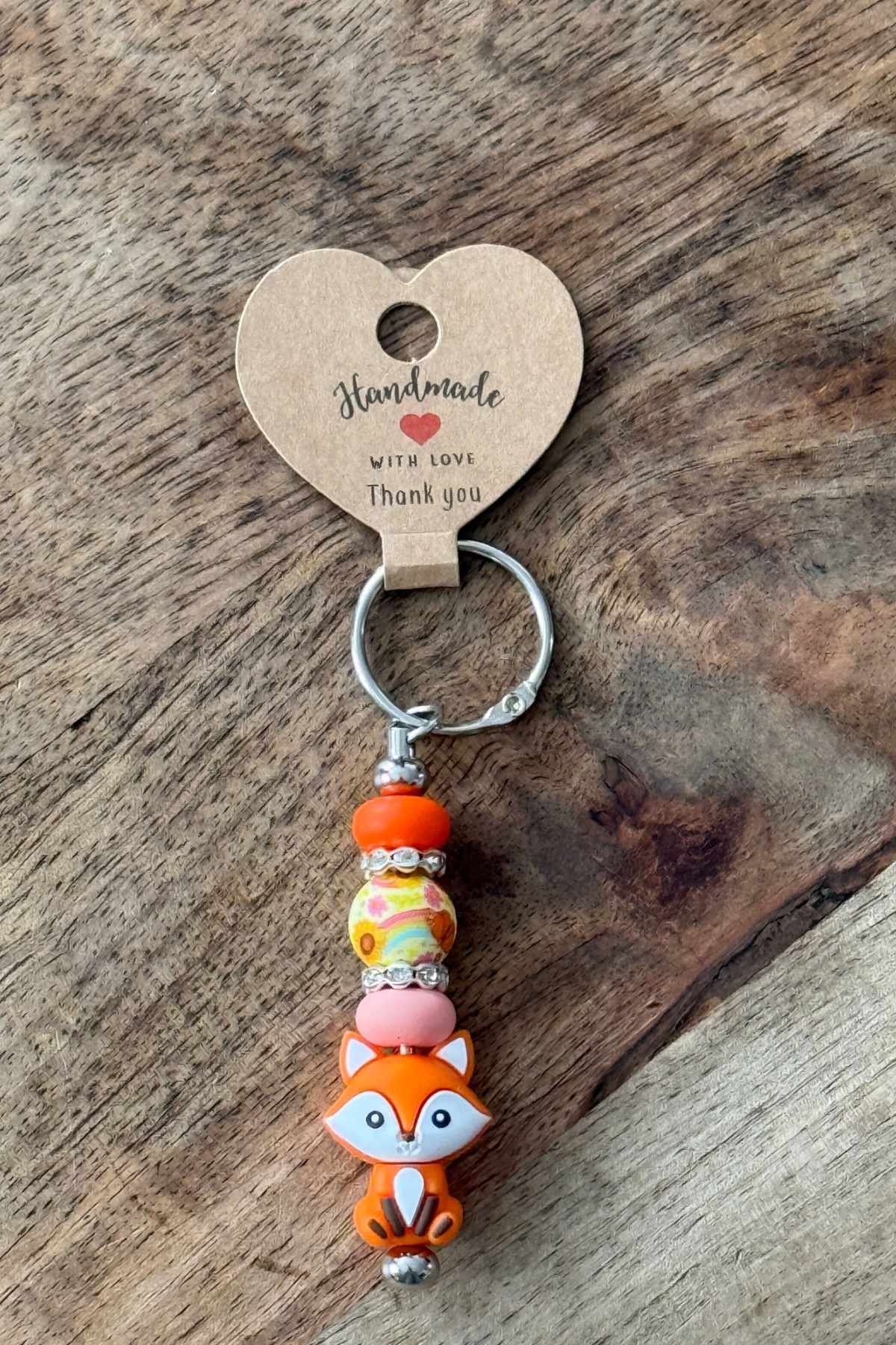 This is our “Cute Little Fox” dangler, with two abacus beads, one floral bead and one fox focal bead.