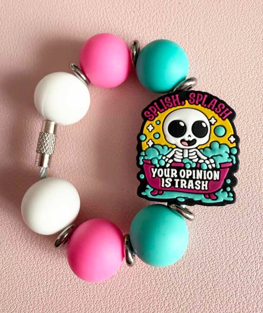 This is our “Splish, Splash, Your Opinion is Trash” dangler, with featuring a cute little skeleton focal bead pink and turquoise coloured beads.