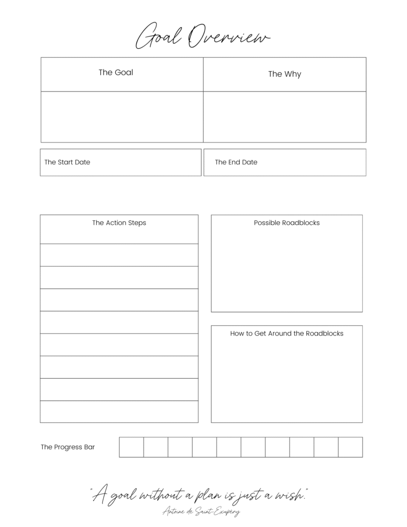 With your planner, you can create a system to track your progress. This could just be a simple checklist or a more elaborate chart. Measuring your small wins along the way helps give you the motivation and keeps you on your timeline. Check out this free goal setting worksheet I created to get you started!